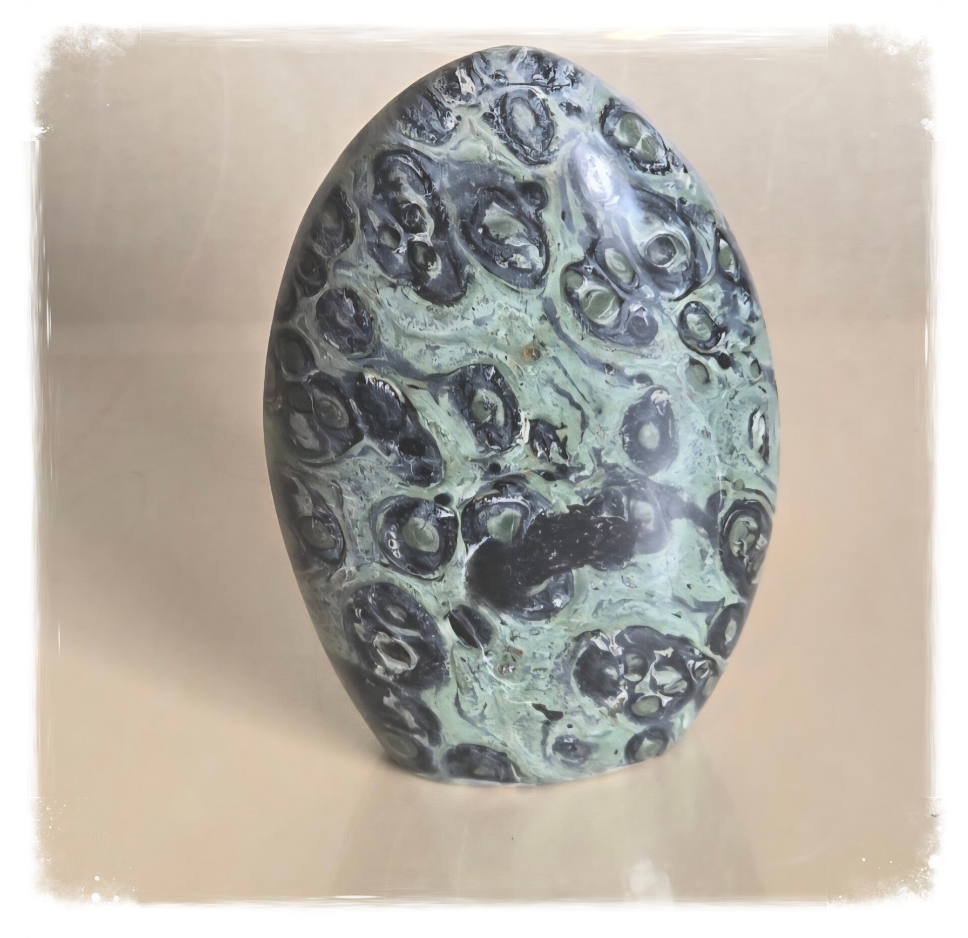 Kambaba is een groen met zwarte steen uit Madagaskar. De steen wordt ook wel Kambaba Jaspis of Kabamba of Eldariet genoemd. Eldariet is de verzamelnaam voor 2 soorten Rhyoliet. Deze steen die bestaat uit de eerste algen die hier op aarde leefden en is wel 3 miljard jaar oud. Energetisch helpt deze krachtige beschermsteen je te verbinden met de ritmes van Moeder aarde. Kambaba helpt je inzichten te krijgen in het doel waarom je op aarde bent. Kambaba werkt als een magische beschermer die gedachten en geest vrijmaakt. Sjamanen in Madagaskar geven deze als beschermsteen aan mensen mee op reis. Door de aanwezigheid van Aegirien kan deze bescherming bieden tegen heftige negativiteit en entiteiten. Ook wordt deze gebruikt als je last hebt van angsten, twijfels, zorgen en fobieën. Kambaba wordt gebruikt als talisman tegen verkoudheid en griep. De steen werkt energetisch helend op de longen en geeft een gevoel van ruimte en vrijheid. Het is een sterk aardende steen welke spirituele rust brengt en het bewustzijn verhoogt. Ook bij het overwinnen van oud verdriet kan de steen een hulpmiddel zijn. Deze helpt het hartchakra te balanceren en versterken. Ook staat de steen voor ommekeer, welke weerstand tegen veranderingen helpt doorbreken. Bij pijnlijke processen in het leven kan Kambaba verzachting en troost bieden. Kambaba werkt energetisch op de hersenen, waardoor deze geschikt is om oude blokkades, programma’s en overtuigingen te helpen herprogrameren. De steen wordt ook gebruikt voor bescherming tegen wifi en andere elektromagnetische straling.