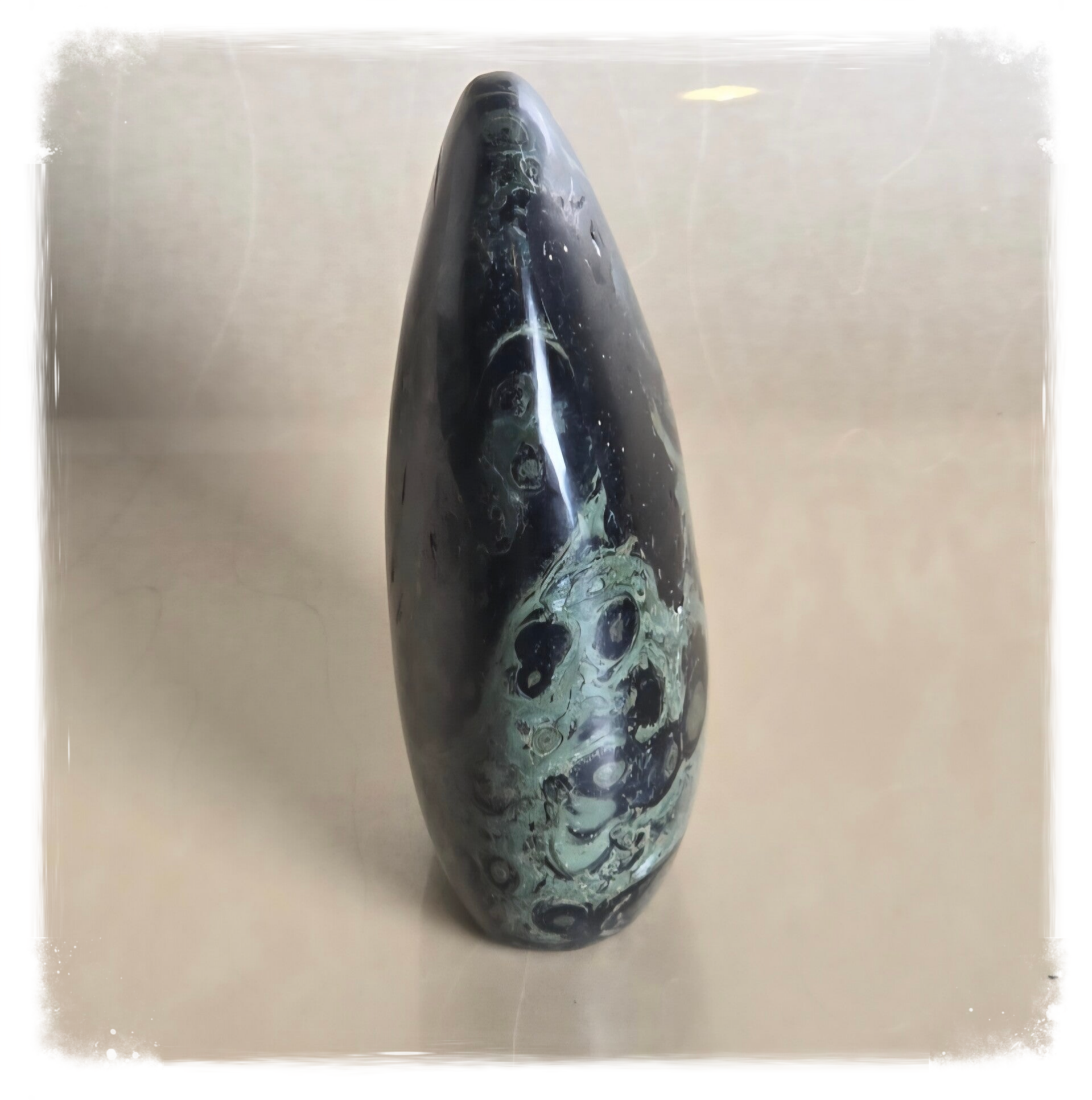 Kambaba is een groen met zwarte steen uit Madagaskar. De steen wordt ook wel Kambaba Jaspis of Kabamba of Eldariet genoemd. Eldariet is de verzamelnaam voor 2 soorten Rhyoliet. Deze steen die bestaat uit de eerste algen die hier op aarde leefden en is wel 3 miljard jaar oud. Energetisch helpt deze krachtige beschermsteen je te verbinden met de ritmes van Moeder aarde. Kambaba helpt je inzichten te krijgen in het doel waarom je op aarde bent. Kambaba werkt als een magische beschermer die gedachten en geest vrijmaakt. Sjamanen in Madagaskar geven deze als beschermsteen aan mensen mee op reis. Door de aanwezigheid van Aegirien kan deze bescherming bieden tegen heftige negativiteit en entiteiten. Ook wordt deze gebruikt als je last hebt van angsten, twijfels, zorgen en fobieën. Kambaba wordt gebruikt als talisman tegen verkoudheid en griep. De steen werkt energetisch helend op de longen en geeft een gevoel van ruimte en vrijheid. Het is een sterk aardende steen welke spirituele rust brengt en het bewustzijn verhoogt. Ook bij het overwinnen van oud verdriet kan de steen een hulpmiddel zijn. Deze helpt het hartchakra te balanceren en versterken. Ook staat de steen voor ommekeer, welke weerstand tegen veranderingen helpt doorbreken. Bij pijnlijke processen in het leven kan Kambaba verzachting en troost bieden. Kambaba werkt energetisch op de hersenen, waardoor deze geschikt is om oude blokkades, programma’s en overtuigingen te helpen herprogrameren. De steen wordt ook gebruikt voor bescherming tegen wifi en andere elektromagnetische straling.
